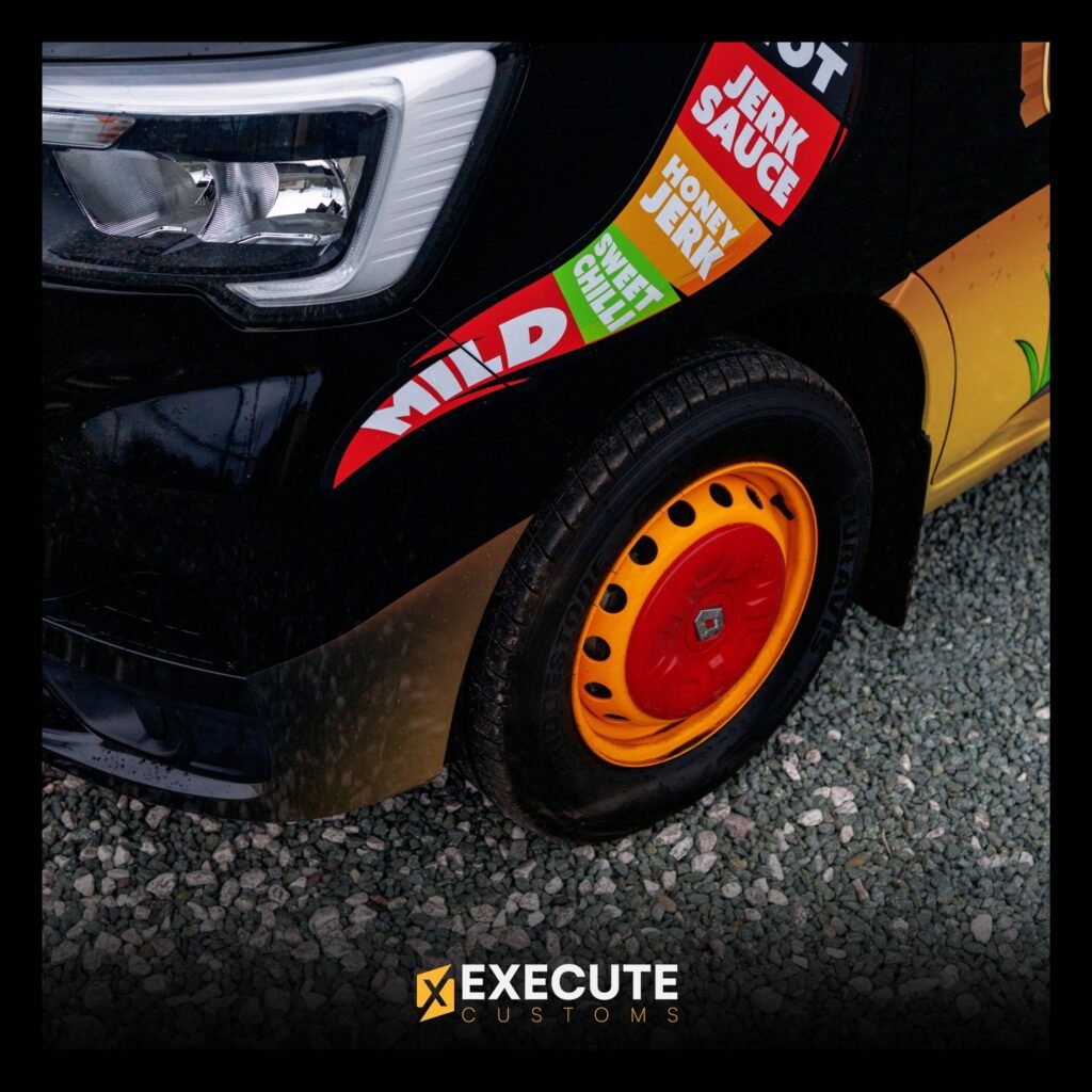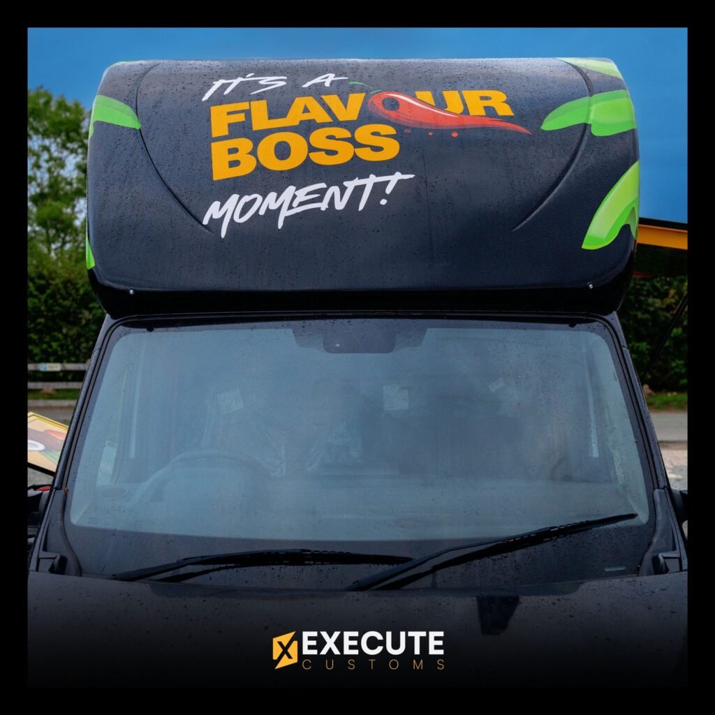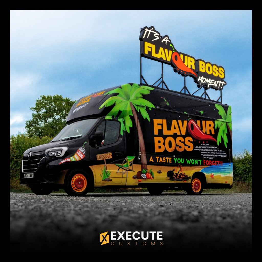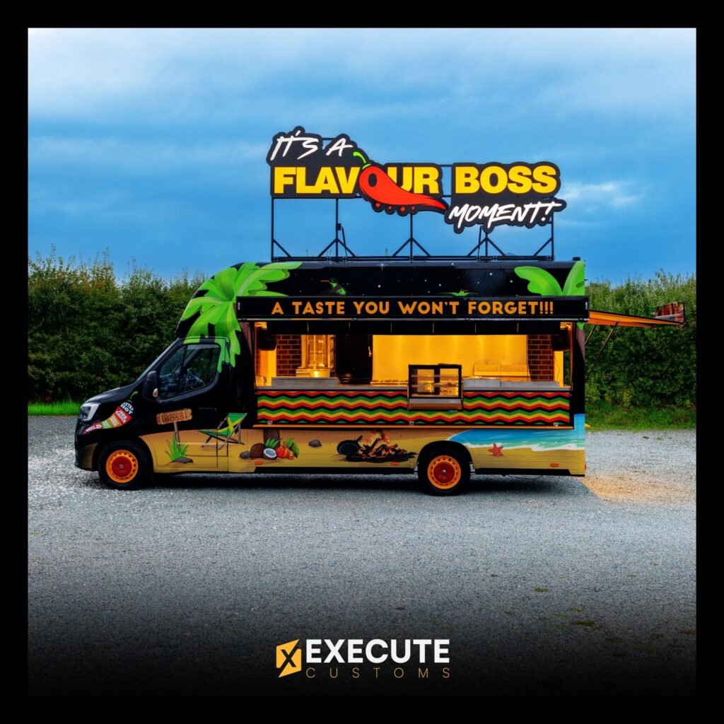 Flavour Boss wanted a food truck that stood out straight away, and this build does exactly that. The bold island-style graphics, bright colours and a huge rooftop sign make the van impossible to miss. It’s designed to look lively, fun and welcoming, while still keeping a strong, professional finish.