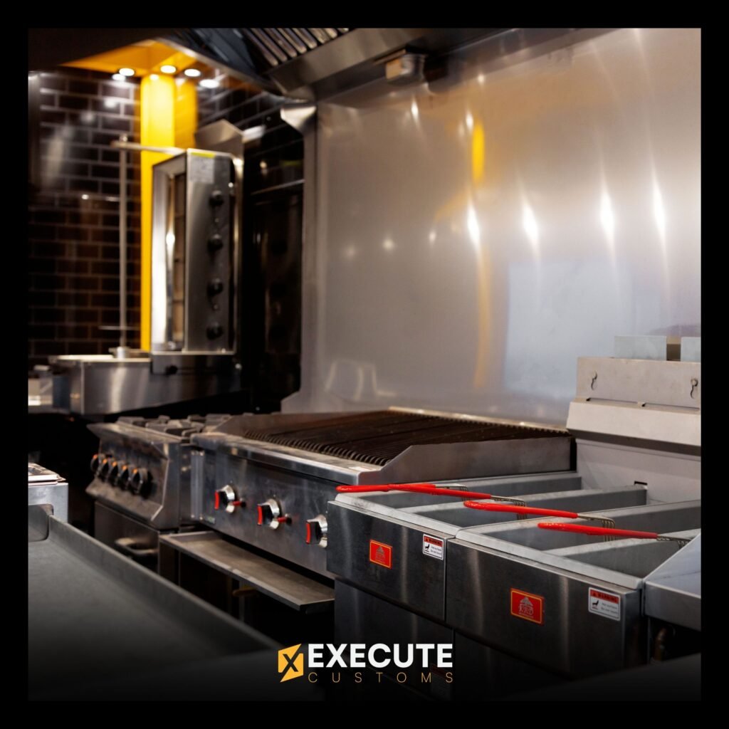 Inside, the layout is built for fast cooking and easy movement. Stainless-steel worktops, brick-style walls and warm lighting give the workspace a clean and solid feel. Everything is spaced out so the team can cook, prep and serve without getting in each other’s way. The hood system, lighting and storage all fit neatly into the build.