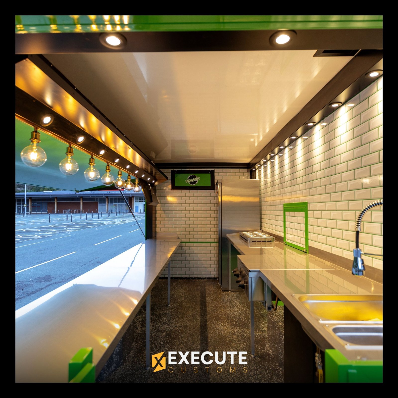 The inside of the Tikka Guys van was built to be as practical as it is stylish. We fitted it with a full stainless-steel kitchen setup, complete with a sink, cooking area, and plenty of counter space for fast-paced service. The clean white brick tiles paired with the brand’s signature green detailing give the interior a fresh, modern feel. Warm lighting and smart layout choices make the space both inviting and efficient, ready to serve up authentic street food in style.